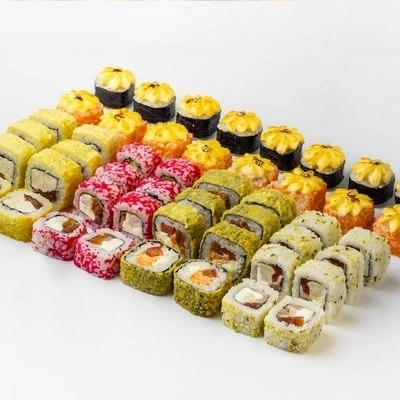 48 шт Калифорния лайт (состав: Рис, нори, икра масаго, сыр сливочный, креветки, слабосоленый лосось, помидоры, салат айсберг) Курица бекон (состав: Рис, нори, сливочный сыр, салат айсберг, помидоры, бекон, курица холодного копчения, кунжут) Запеченный окунь омлет (состав: Рис, нори, икра масаго, сыр сливочный, жаренный окунь, омлет томаго, фирменный соус для запекания, соус унаги, кунжут) Яки (состав: Рис, нори, снежный краб, жаренный лосось, огурцы, фирменный соус для запекания, соус унаги, кунжут) Темпура с курицей (состав: Рис, нори, курица холодного копчения, помидоры, кляр, сухари панко, соус унаги, кунжут) Темпура лосось-окунь (состав: Рис, нори , сливочный сыр, ,жареный лосось ,помидоры, окунь жареный, сухари Панко, кляр для роллов,соус унаги, кунжут) Годен в течении 3 часов при t 20°C, 12 часов при t 4±2°C. Изображение на сайте и внешний вид продукта могут отличаться.