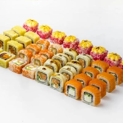 40 шт Филадельфия (состав: Рис, нори, сливочный сыр, огурцы, слабосоленый лосось) Креветка-лайт (состав: Рис, нори, икра масаго , творожный сыр, салат айсберг, креветки в темпуре) Аками (состав:Рис, нори, сливочный сыр, жареный лосось, помидоры, салат айсберг, кляр, сухари панко, соус унаги, кунжут) Рис, нори, икра масаго, снежный краб, отварные креветки, огурцы, фирменный соус для запекания, соус унаги, кунжут) Канада с жареным лососем (состав: Рис, нори , сливочный сыр, лосось жареный, огурцы, угорь, фирменный соус для запекания, соус унаги, кунжут) Годен в течении 3 часов при t 20°C, 12 часов при t 4±2°C. Изображение на сайте и внешний вид продукта могут отличаться.